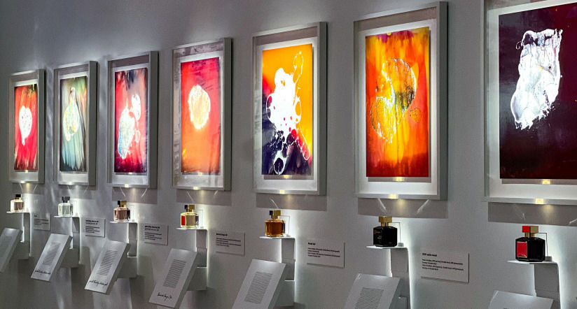 L’exposition montrait aussi comment la Maison Francis Kurkdjian peut devenir source d’inspiration pour d’autres artistes. Les images de la photographe Christelle Boulé, créées à partir de gouttes de parfum posées sur du papier argentique, ressemblaient à des paysages microscopiques ou cosmiques, des colorations abstraites où chaque fragrance trouvait une manière d’apparaître.